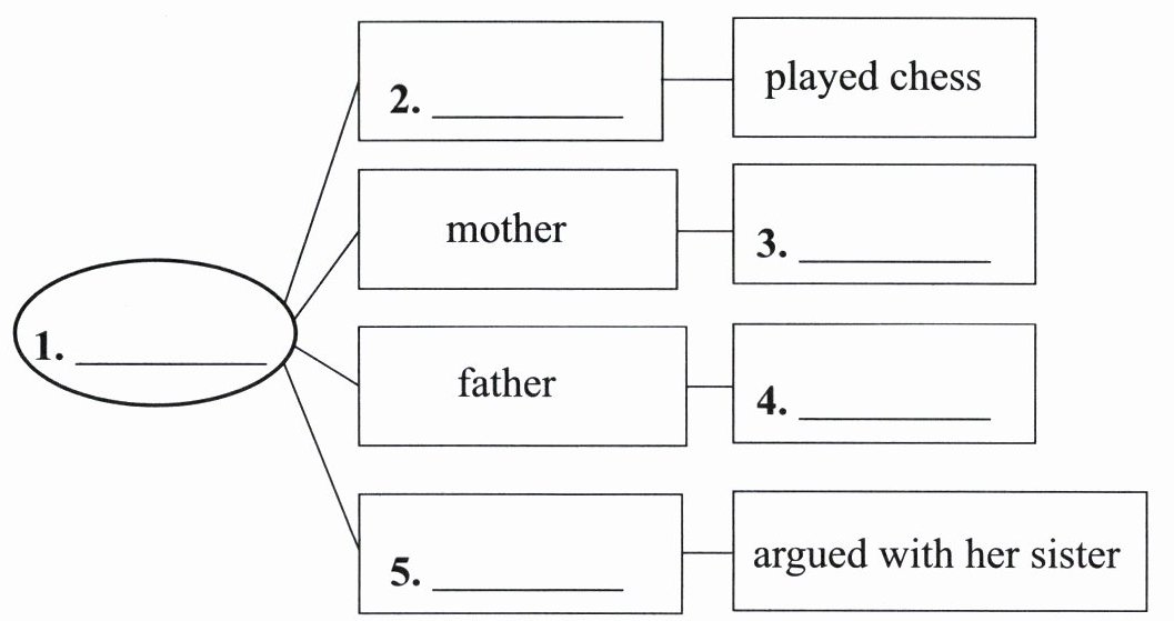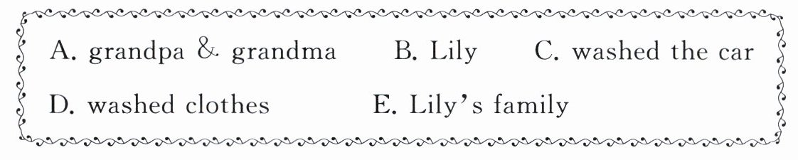 I am Lily. What did my family do last Sunday? Let me tell you now. My grandpa played chess with Grandma. My father washed his car. My mother washed clothes. My sister took my new skirt. She wanted to wear it. And I argued with her. But I finally(最终)found(发现)my skirt on the line. My mother washed it for me. I said(说)sorry to my sister.