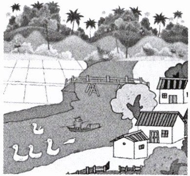 There is a river. There is a bridge over the river. There are some ducks on the river. There are many houses beside the river. There are many trees and green grass.