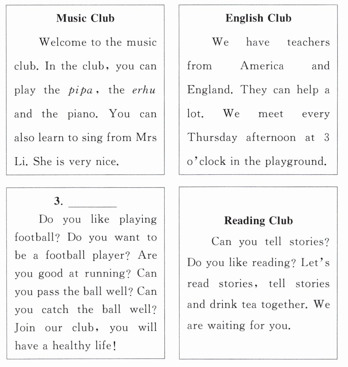 3. A 任务二:4. We can play the pipa, the erhu and the piano. We can also learn to sing from Mrs Li. 5. I want to go to the Football Club. Because I like playing football.(只要言之有理即可)