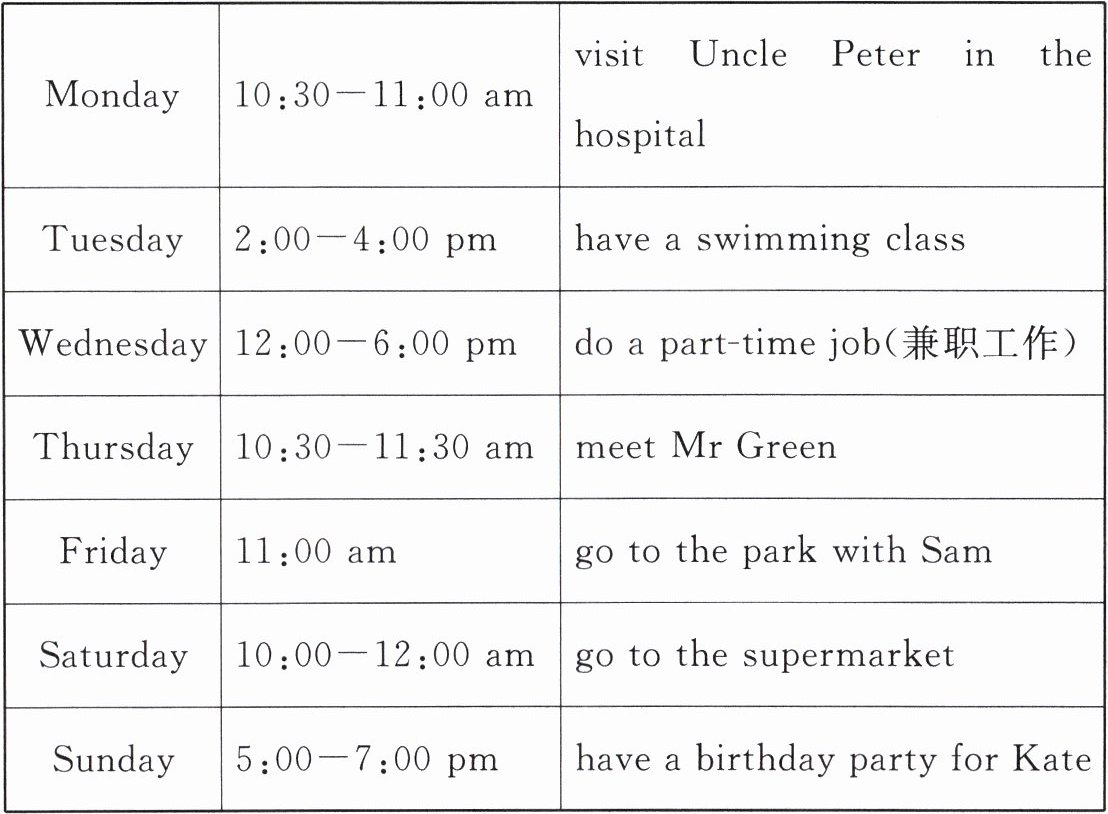 B 篇:根据 John 假期里一周的日程表,选择正确答案。(10 分)