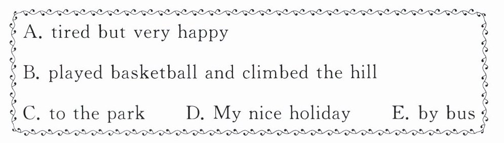 It was sunny yesterday. It was a holiday. I got up at eight in the morning. After breakfast,I went to the park with Amy by bus. There were so many people in the park. Some men played chess under the big tree. Some women danced happily near the tree. Amy and I played basketball and climbed the hill. We went home at half past five in the afternoon. We were tired but very happy.
