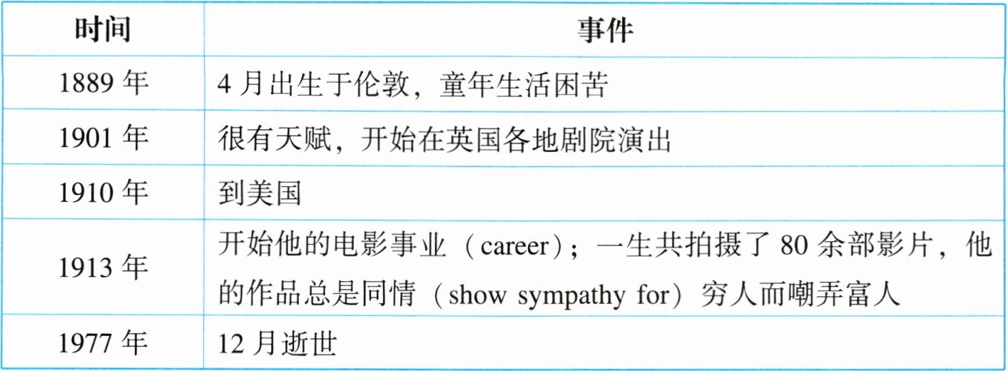He was born in London in April 1889. He led a hard life during his childhood but he was a gifted boy. At the age of 12, he began to perform at different theatres across Britain. In 1910, he went to the USA and started his film career there in 1913. He made more than 80 films in his life. And his works always show sympathy for the poor and make fun of the rich. Charlie Chaplin died in December 1977.
