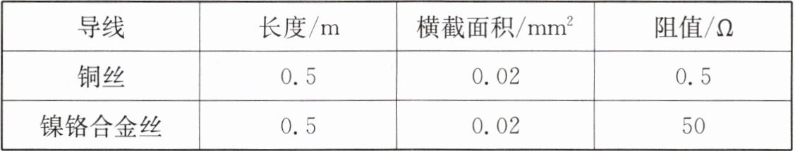 (填“铜丝”或“镍铬合金丝”)更合适。|导线|长度/m|横截面积$/mm^2$|阻值/Ω|