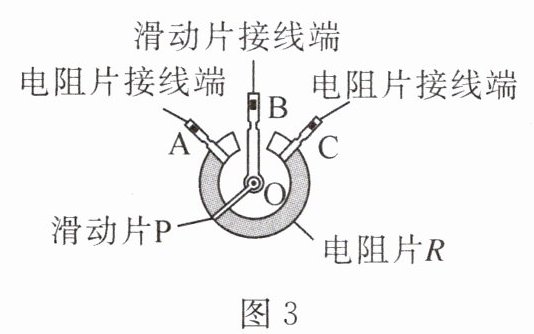 (1)电位器的构造:如图3是电位器的结构示意图,电阻片R的两端分别与接线端A、C相连,滑动片P的一端通过转轴O与接线端B相连,另一端与电阻片R接触良好,并能绕转轴O在电阻片R上滑动。