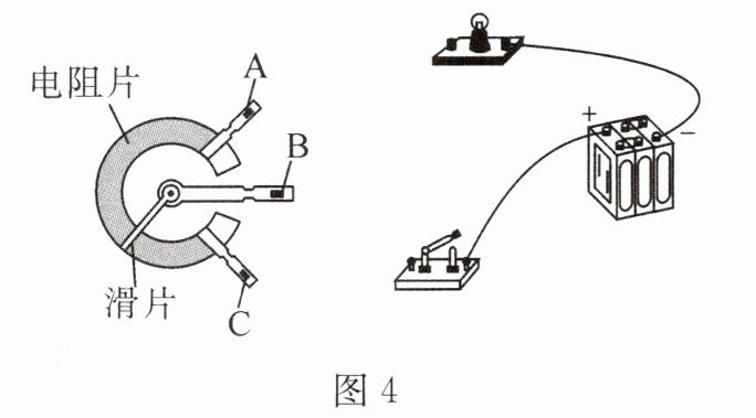 如图4,请选择电位器A、B、C三个接线端其中的两个连入电路中,要求顺时针旋转滑片时,灯泡变暗。