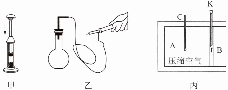 6. 如图甲所示,在一个配有活塞的厚玻璃筒里放一团小棉花,把活塞迅速压下去,棉花被点燃. 如图乙所示,瓶内装有一些水,用瓶塞将瓶口塞紧,瓶塞通过导管与打气筒相连. 用打气筒给瓶中打气,当瓶塞跳起来时,瓶口周围冒“白气”.
