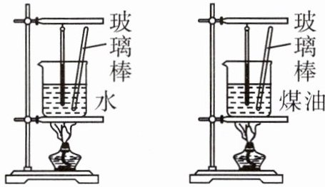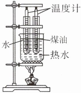 3. 实验器材:2支相同的温度计、2个烧杯、水、煤油、2个相同的电加热器(或2个相同的酒精灯、2个铁架台)、