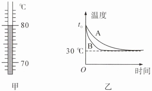 练 4.(2024 年镇江市)为比较$A$、$B$两保温杯的保温性能,小红在两个保温杯中分别倒入$0.1\ kg$相同温度的热水,用温度计测量其初温$t_0$,示数如图甲所示,$t_0= $
