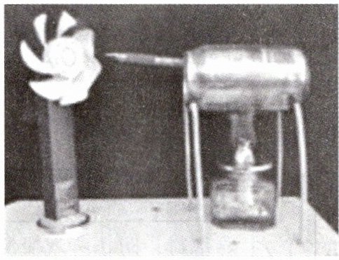 答:在简易热机中,工作物质受热后膨胀,对外做功,我们可以选取容易被推动或转动的物体作为工作物质做功的对象,例如风叶.工作物质驱动风叶转动而做功,消耗了