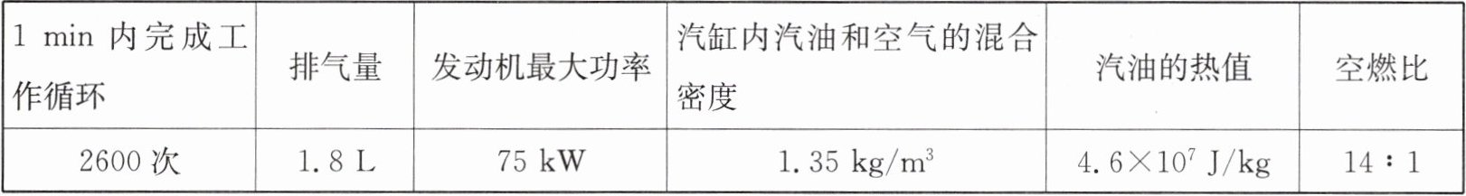 解:由ρ=m/V得,做一次功需要燃气的质量为m燃气=ρV=1.35 kg/m³×1.8×10⁻³m³=2.43×10⁻³kg,因为空燃比是14:1,所以做一次功消耗的汽油质量为m汽油=2.43×10⁻³kg×1/15=1.62×10⁻⁴kg,由q=Q/m得1 min内汽油燃烧释放的热量为Q=m汽油q=1.62×10⁻⁴kg×4.6×10⁷J/kg×2600=1.93752×10⁷J,根据P=W有/t可知发动机所做的有用功为W有=Pt=75000W×60s=4.5×10⁶J,所以发动机的效率为η=W有/Q×100%=4.5×10⁶J/1.93752×10⁷J×100%≈23.2%.