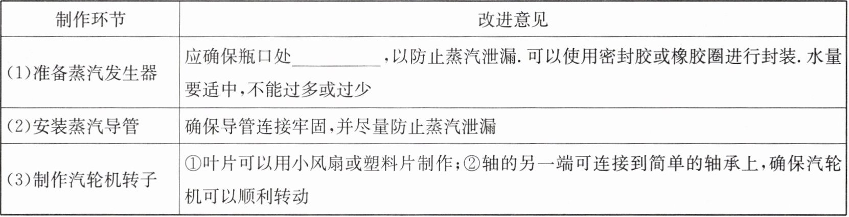 |(3)制作汽轮机转子|①叶片可以用小风扇或塑料片制作;②轴的另一端可连接到简单的轴承上,确保汽轮机可以顺利转动|