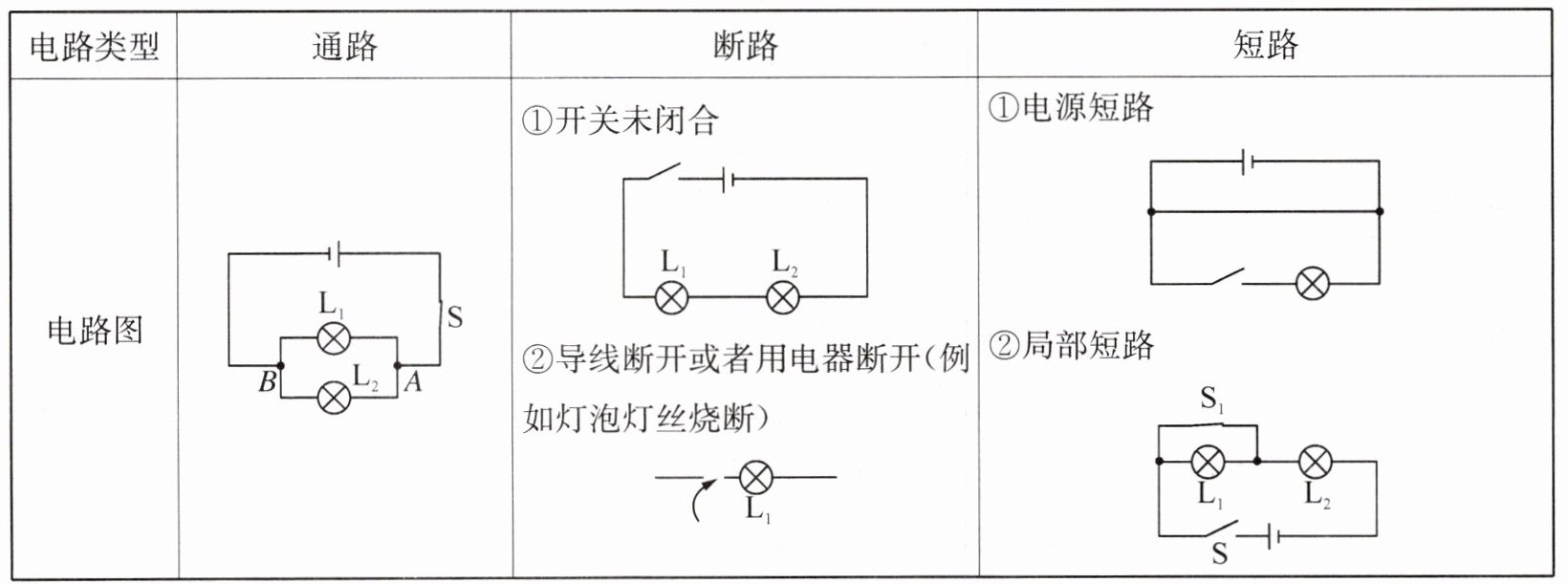 (1) 用电器能够工作的电路叫通路. 电路中某处被切断,电路中就不会有电流流过,这种电路叫断路. 直接用导线将电源的正、负极连接起来,这种电路叫电源短路.