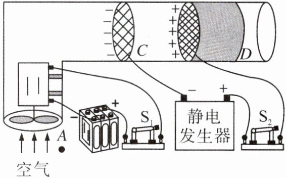 7. [科技发展]雾霾天气的主要污染物是PM2.5,PM2.5是大气中直径小于等于2.5μm的颗粒悬浮物,它们在空中做无规则运动,很难自然沉降到地面,吸入后会进入血液对人体形成危害. 如图为某大学的科研队伍成功研制出PM2.5净化器. 闭合开关$S_1、$$S_2$后: