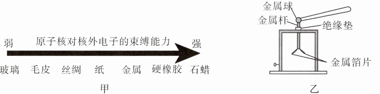 6. 图甲为部分物质的原子核对核外电子束缚能力强弱情况,束缚能力越弱越容易失去电子. 现用丝绸摩擦石蜡,然后将该石蜡靠近轻质小球,发现它们相互排斥,再将石蜡触碰了验电器的金属球,发现金属箔片张开,如图乙. 下列说法中正确的是(
