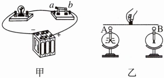 典例1:如图甲闭合开关后灯泡发光,如图乙用带绝缘柄的金属棒把A、B两个验电器连接起来的瞬间(验电器带电情况见图乙). 根据图中信息可以判断出(