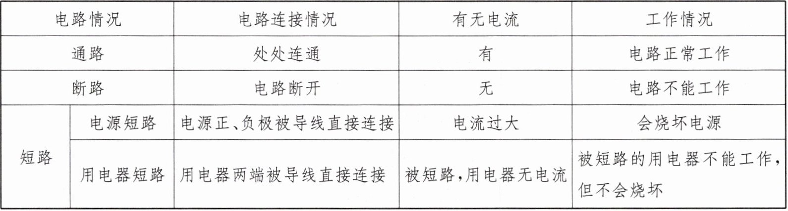 | |用电器短路|用电器两端被导线直接连接|被短路,用电器无电流|被短路的用电器不能工作,但不会烧坏|