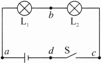 典例2:(2023年鄂州市)如图所示,开关S闭合时,小灯泡$L_1、$$L_2$都不亮,用一段导线的两端接触a、b两点时,两小灯泡都不亮;接触b、c两点时,两小灯泡也不亮;接触c、d两点时,两小灯泡都亮. 对此,下列判断中可能的是(