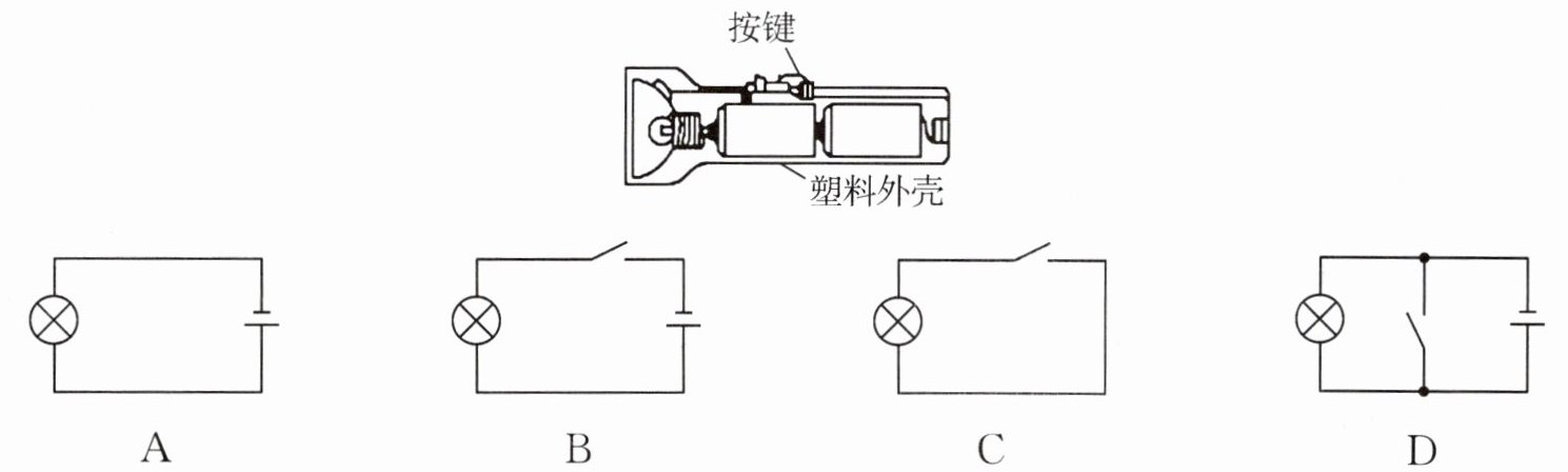 2. 手电筒的结构如图所示,按下按键时,电路接通小灯泡发光. 该手电筒的电路图,选项图中正确的是(