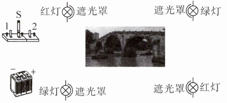 6. (2023 年常州市,改编)京杭大运河上的古桥——拱宸桥两侧,安装了水上红绿灯,实现同一时间段内仅让船舶单向通过桥洞。图中开关 $ S $ 中央的金属片自动与触点 1 或 2 接触。请用笔画线代替导线完成电路连接。