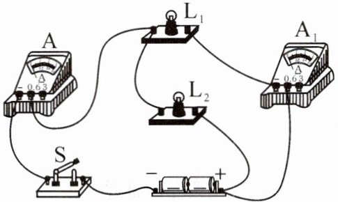 典例:(2023年鄂州市)在如图所示的实验电路中,闭合开关$S$后,电流表$A的示数为0.5\ A$,电流表$A_1的示数为0.3\ A$。下列说法正确的是(