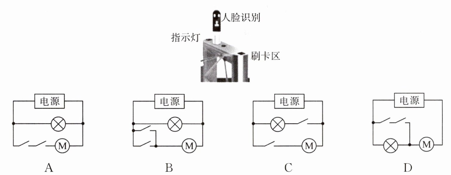 1. (2024 年黑龙江省)如图为封闭小区常见的智能门禁系统,住户通过刷卡或人脸识别进入小区,当门禁系统接通电源后,指示灯发光。住户刷卡或人脸识别成功时(相当于分别闭合对应的开关),电动机工作,控制门打开。下列关于门禁系统的简化电路设计合理的是(
