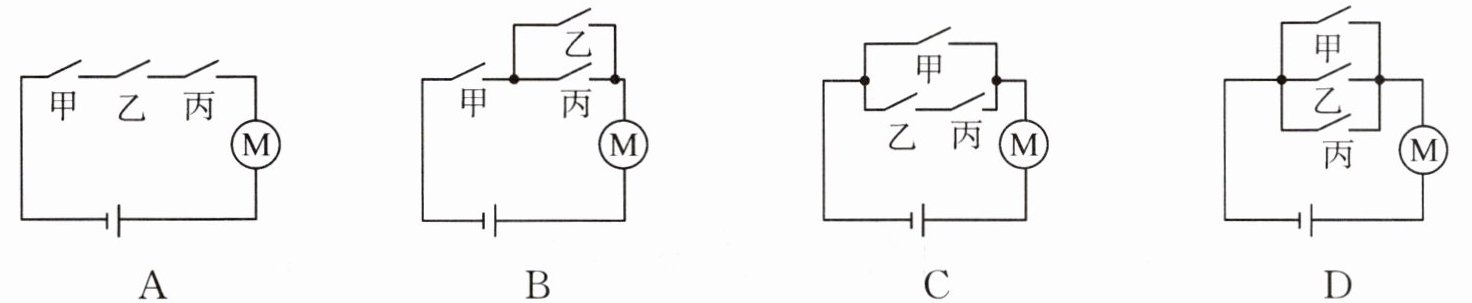 2. 小明同学为学校实验室设计了危险品专柜门的电路图。根据要求,必须是分管领导和其中一名管理员同时使用钥匙(相当于开关闭合)才能打开柜门(电动机工作)。甲为分管领导使用的钥匙,乙和丙分别是两名管理员使用的钥匙,以下符合要求的电路是(