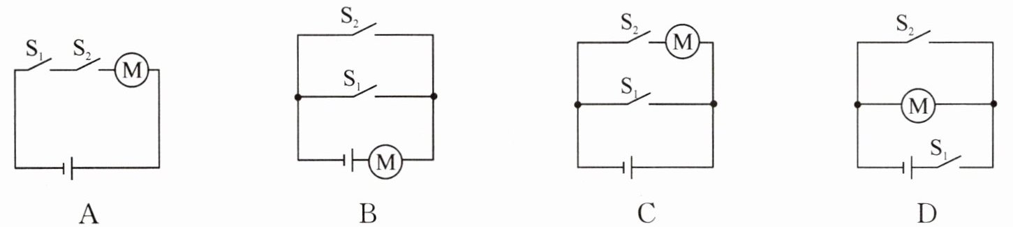 3. (2024 年长沙市)中国高铁技术世界领先,给人们出行带来极大的便利。乘客进站时,需同时通过身份验证(相当于闭合 $ S_1 $)和人脸识别(相当于闭合 $ S_2 $),方可开启闸机 $ M $,下列电路设计符合要求的是(
