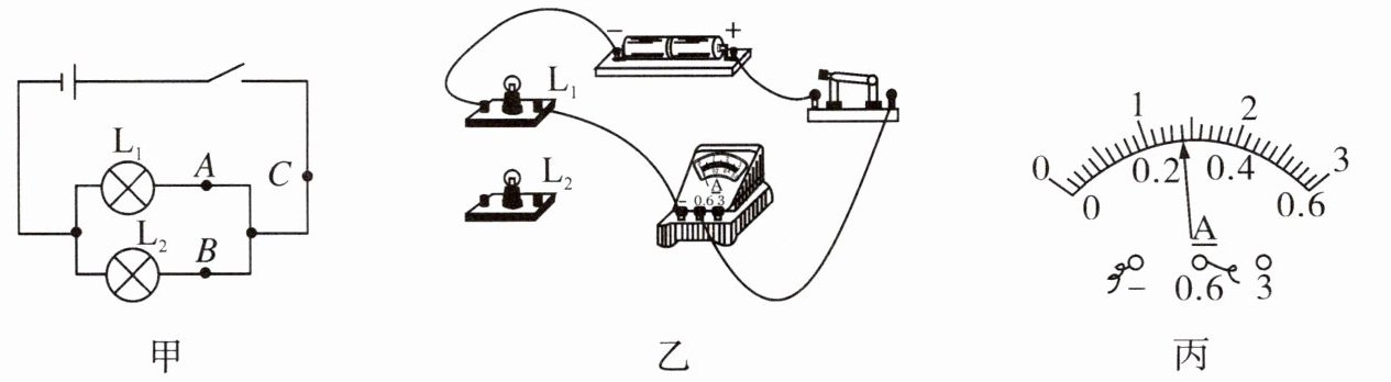 (2)用电流表分别测量$A$、$B$、$C$三点的电流,更换灯泡多次测量,将实验数据记录在表格中,其中第 4 次实验中$B$点的电流如图丙所示,则$I_B = $______$A$;分析数据可知:并联电路中电流的特点是______.