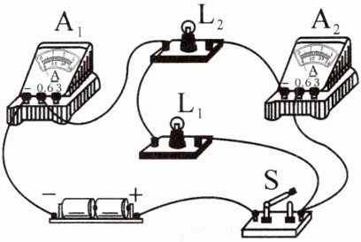 练 10.(2023 年天津市)小明在探究“串、并联电路中电流的规律”时,做了如图所示的实验.闭合开关后,电流表$A_1$、$A_2的示数分别为0.5\ A和0.3\ A$,则通过小灯泡$L_1$的电流为