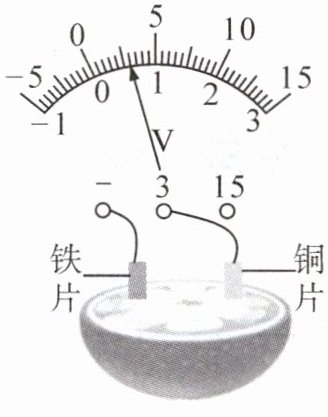 4. 如图所示,把铜片、铁片插入橙子中,制成一个水果电池.用电压表测得其电压为