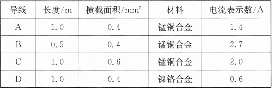 |导线|长度/m|横截面积/mm^2|材料|电流表示数/A|
