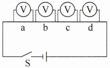13. [实验创新]将电阻丝 $ a $、$ b $、$ c $、$ d $ 串联接在下图电路中,闭合开关 $ S $,比较电压表的示数大小. 若电压表的示数越大,表示待测电阻丝的阻值越______(填“大”或“小”),这样只需要连接一次电路,就可以比较出四根电阻丝的电阻大小.