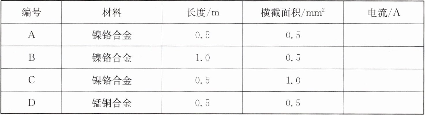 |编号|材料|长度/m|横截面积/mm^2|电流/A|
