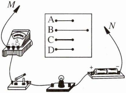 实验特训:(2023年西藏自治区)某学习小组在“探究影响导体电阻大小的因素”实验时,设计了如图所示的实验装置,实验中分别将 $ A $、$ B $、$ C $、$ D $ 四根导线接入电路,四根导线的材料规格如表所示.