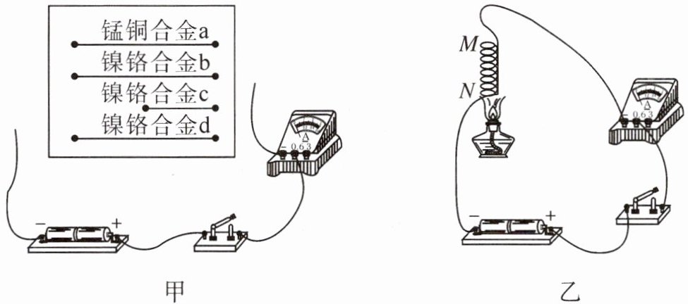 (4)把一段钨丝 $ MN $ 连接在电路中,如图乙,闭合开关,用酒精灯给钨丝加热,发现电流表示数变小,这表明:温度升高,钨丝的电阻变