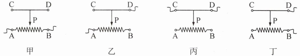 A。如图表示的是滑动变阻器的四种接法,当滑动变阻器的滑片向右移动时,电阻值变大的是乙