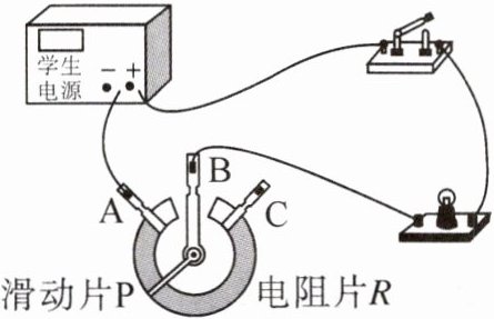 ▶典例1:小文同学利用的电位器、直流稳压电源、导线、开关和小灯泡,组装了一个调光台灯,电路如图所示,A、B、C均为电阻片接线端。滑动片P顺时针向A端滑动的过程中,电位器接入电路中的电阻