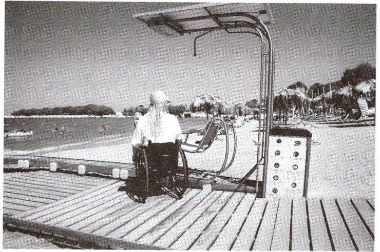 ④Mr. Fotiou wanted to find an easier way for wheelchair users to get into the water. He worked hard with others to develop the Seatrac system. He made the system simple to put in place and easy to run. A wooden walkway allows wheelchair users to reach the Seatrac. The system is solar - powered, and can keep running even if the electricity goes out.
