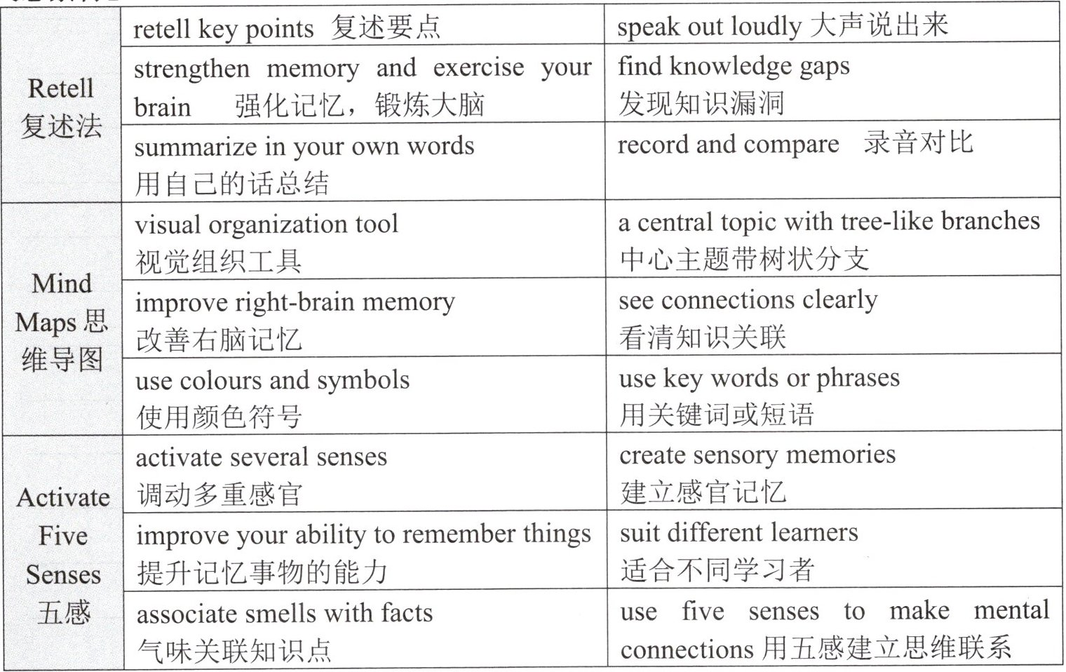【必备短语】1. effective ways to remember things 2. stay focused 3. activate brain areas 4. suit learners 5. reduce exam stress 6. build a knowledge network 7. practise daily 8. improve grades 【亮点句型】1. If you use this technique regularly, your memory will improve. 2. I strongly suggest that you use this method in science subjects. 3. Studies have shown that using mind maps can help learners remember 30% more information. 4. The more senses you activate, the stronger your memory will be. 【你的精彩】mind maps with you, a visual tool to boost memory. It has a central topic with tree-like branches, using key words and colors. It improves right-brain memory and shows connections clearly. First, write the main topic, then add branches with key words and use colors. Practise daily, and your memory will get better! Best wishes, Li Hua