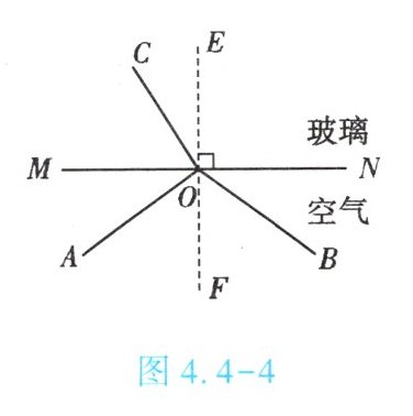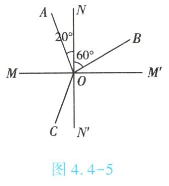 3. (★★)一束光在玻璃和空气两种物质中传播,在分界面发生了反射和折射,如图 4.4 - 5 所示,$MM'$ 和 $NN'$ 互相垂直,是分界面或者法线,其他为光线。根据图中角度关系可知,