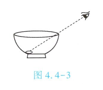 3. (★★)《康熙几暇格物编》中记载:“置钱碗底,远视若无,及盛满水时,则钱随水光而显现矣。”如图 4.4 - 3 所示,把硬币放在碗底,后退到眼睛恰好看不到硬币,保持眼睛、碗和硬币的位置不变,缓缓向碗里倒水,又再次看到硬币,这是光从