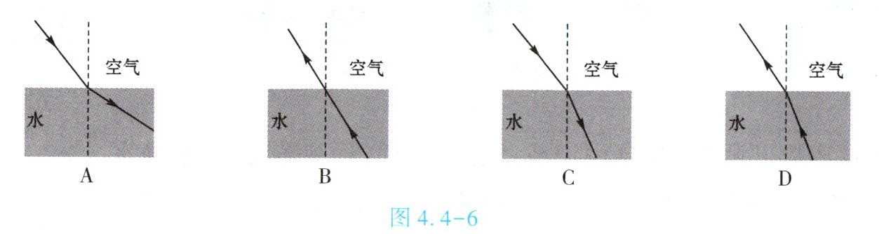 4. (★★)去年暑假,小梦陪着爷爷到湖里去叉鱼。小梦将钢叉向看到鱼的方向投掷,总是叉不到鱼。如图 4.4 - 6 所示的四幅光路图中,能正确说明叉不到鱼的原因的是【