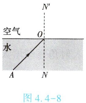 6. (★★)如图 4.4 - 8 所示,一束光从水中斜射入空气中,已知入射光线 $AO$,请画出它的反射光线 $OB$ 和折射光线 $OC$ 的大致方向。