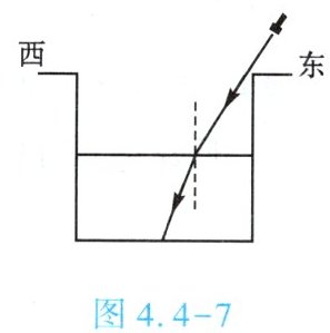 5. (★★)如图 4.4 - 7 所示,一盏探照灯装在东面看台上,灯光朝西斜向下刚好射到游泳池底部中央,在将游泳池逐渐灌满水的过程中,池底的光斑将【