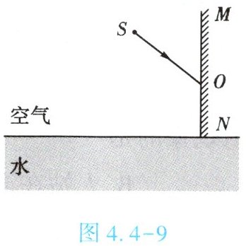 7. (★★)如图 4.4 - 9 所示,根据点光源 $S$ 发出的入射光线,画出经平面镜 $MN$ 的反射光线及进入水中的折射光线。