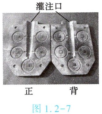 9. (★★★)如图1.2-7所示,“钱范”是古代铸造钱币所用的模具,由正、背两块组成,内部均刻有图文。铸币时,合上正、背两块,将液态金属灌入其内,待液态金属凝固后取出,即可得到金属钱币。下表提供两种材料在$1.01×10^5Pa$大气压下的熔点,请回答: