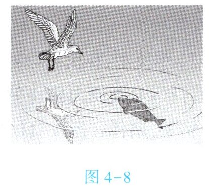 4. (★★)如图4-8所示,小明站在湖边看到小鱼在水中游动,同时发现有一只“鸟”在水中飞翔,似乎在模仿水面上方另一只鸟的飞翔动作。以下说法正确的是【