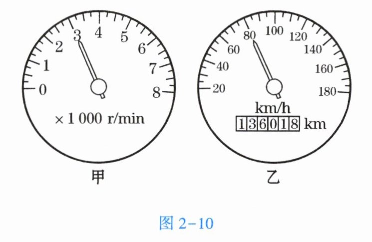 20. 小明利用假日到凯里玩,汽车行驶了一会儿,他看到了如图 2 - 9 所示标志。他想知道此时汽车行驶的速度是多少,便观察了有关仪表,如图 2 - 10 所示。