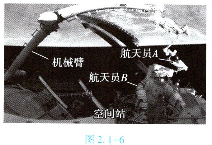 2. (★★)(2024·湖北)2024 年 5 月 28 日,“神舟十八号”航天员圆满完成出舱任务。如图 2.1 - 6 所示,搭乘机械臂的航天员 A 已为空间站安装好空间碎片防护装置,航天员 B 正在出舱。以空间站为参照物,安装好的防护装置是