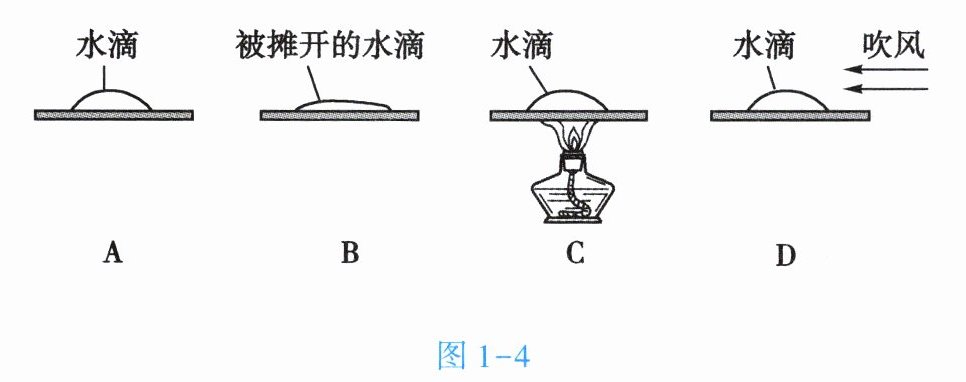 17. 小梅同学在 4 块相同的玻璃板上各滴一滴质量相同的水,进行如图 1-4 所示的实验探究,得出水蒸发快慢与水的温度、水的表面积和水面上方空气流动快慢有关。
